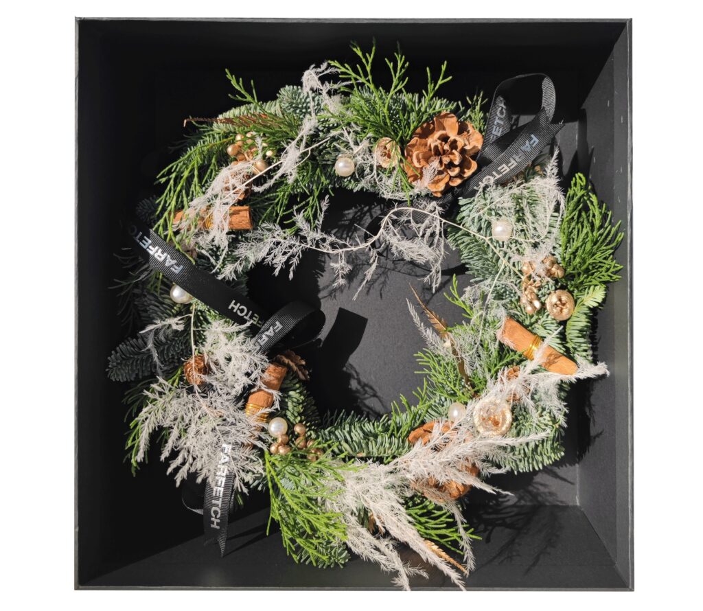 För att göra gåvan ännu mer unik designade vi ett presentband med Farfetchs logotyp, som knyts runt kransen. Detta förstärker den personliga och exklusiva känslan och visar omtanke mot mottagaren. Små detaljer gör stor skillnad, och denna julgåva är ett tydligt exempel på hur personliga inslag kan höja upplevelsen av en present.