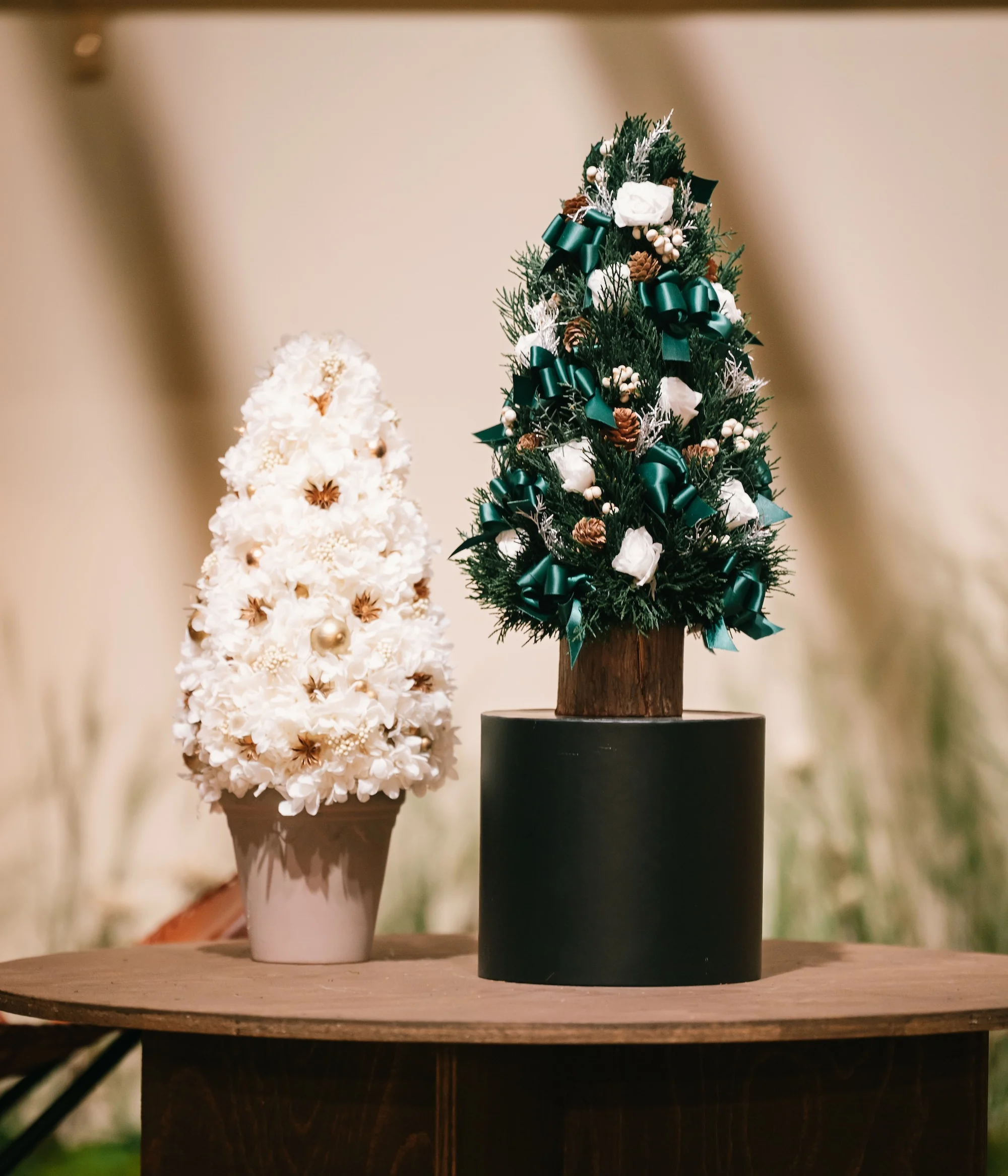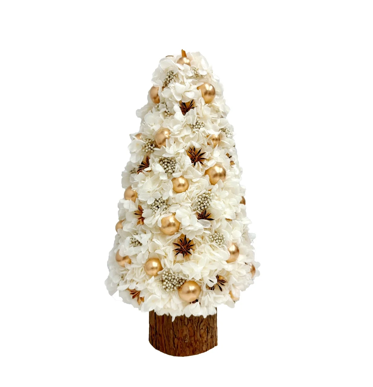Handgjord mini-julgran av konserverad vit hortensia, guldiga julkulor och konserverade småblommor i ett elegant format | En charmig och underhållsfri dekoration