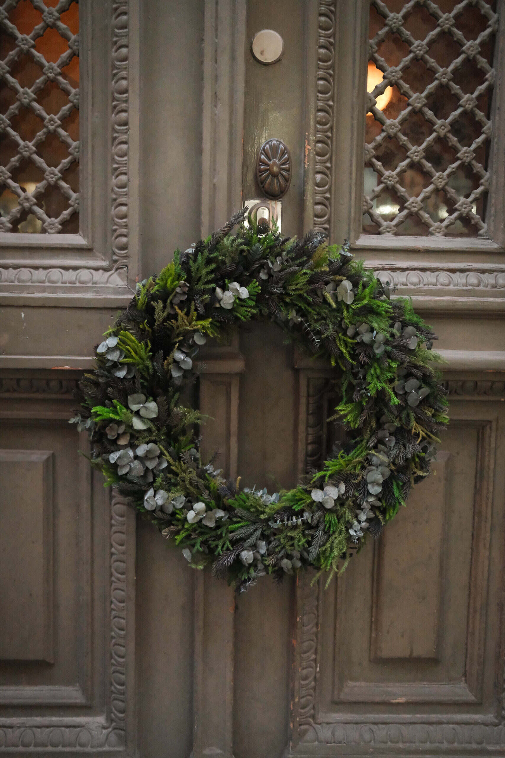 Handbunden krans av konserverad Eukalyptus och Lumrar i skogsgröna toner / dörrkrans / dekoration