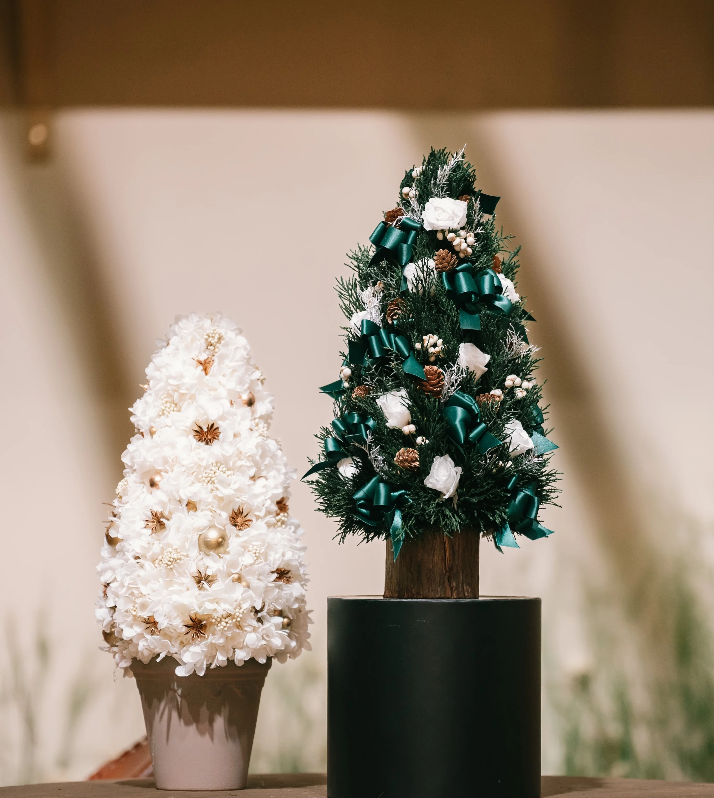 En Festlig Jul – mini gran, är en handgjord mini-julgran med konserverad gran, vita rosor och kottar i festliga gröna färger och rosetter | En charmig och underhållsfri dekoration