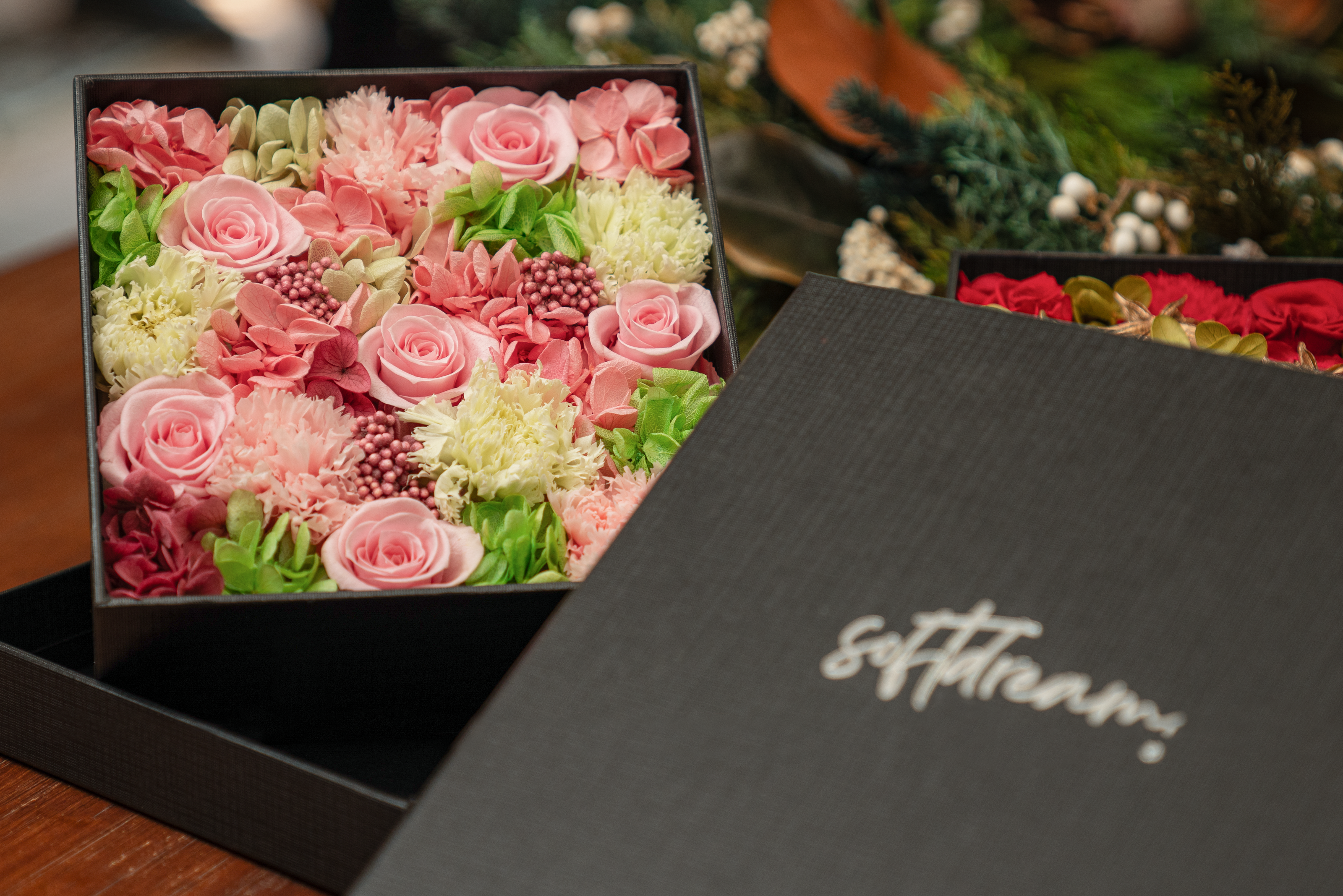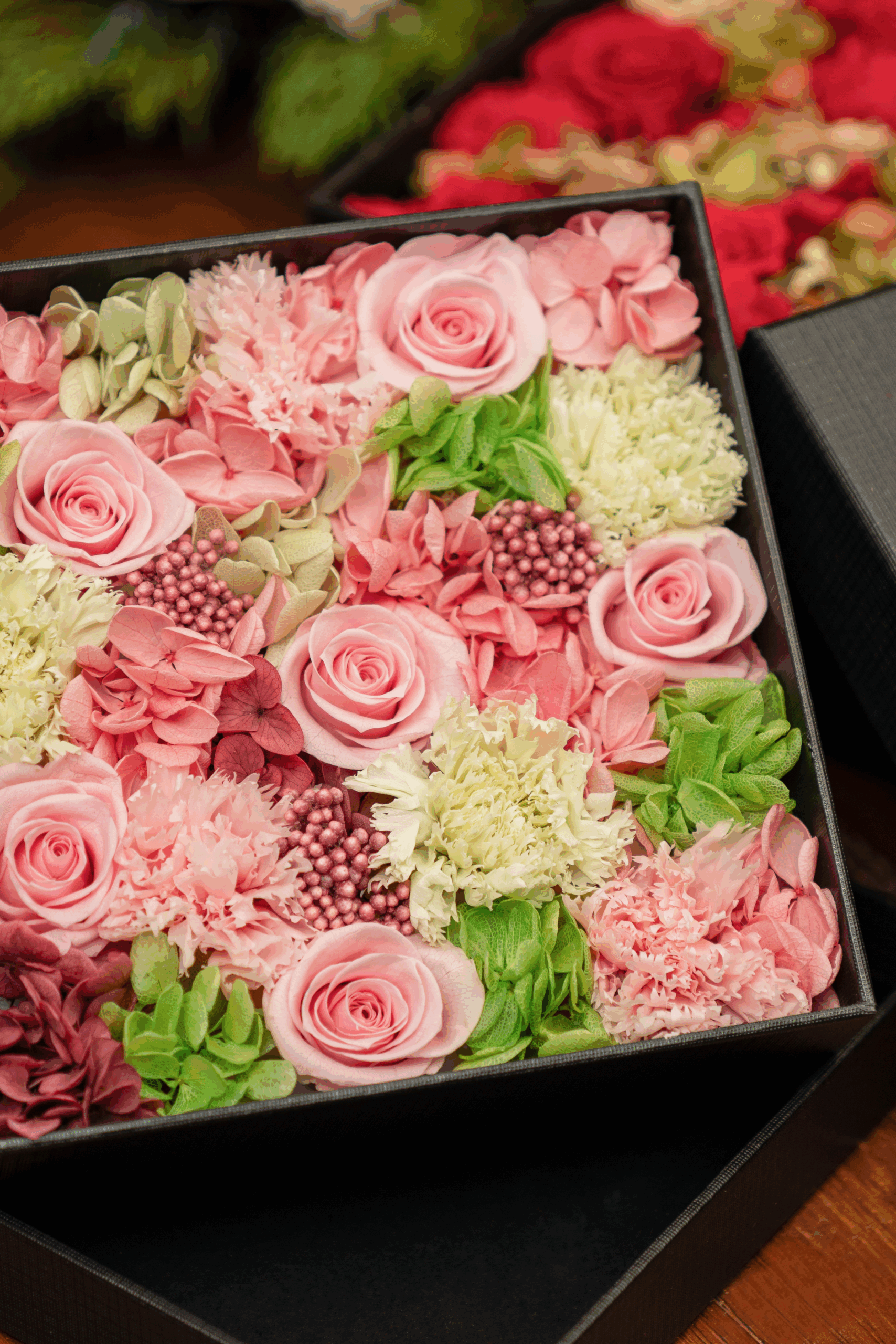 Blomsterlåda med konserverade Hortensior, Ros, Nejlikor/present/home dekoration