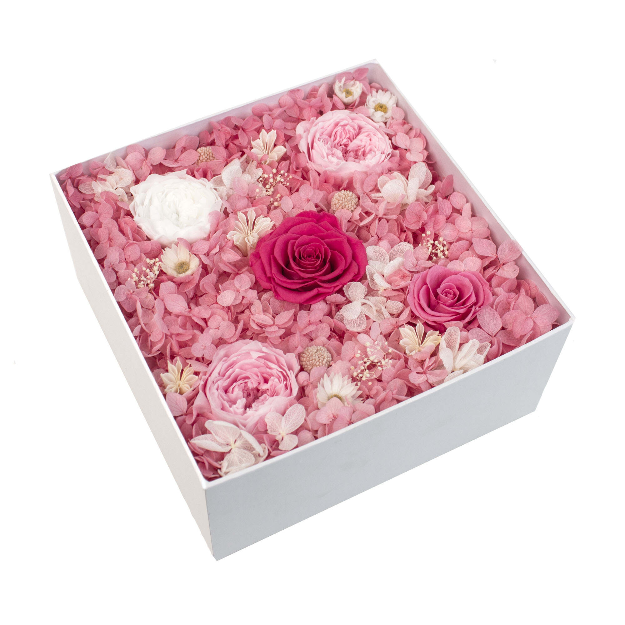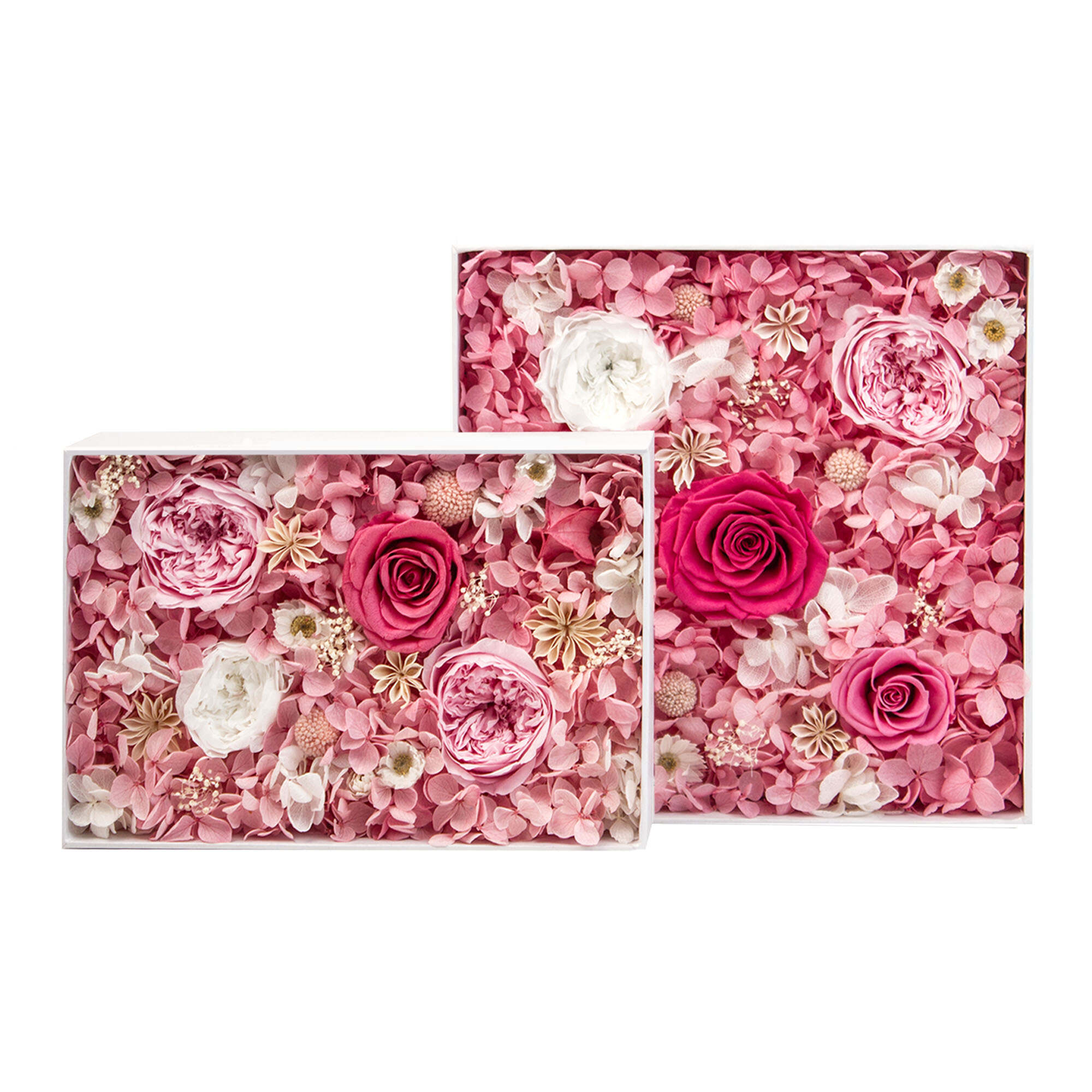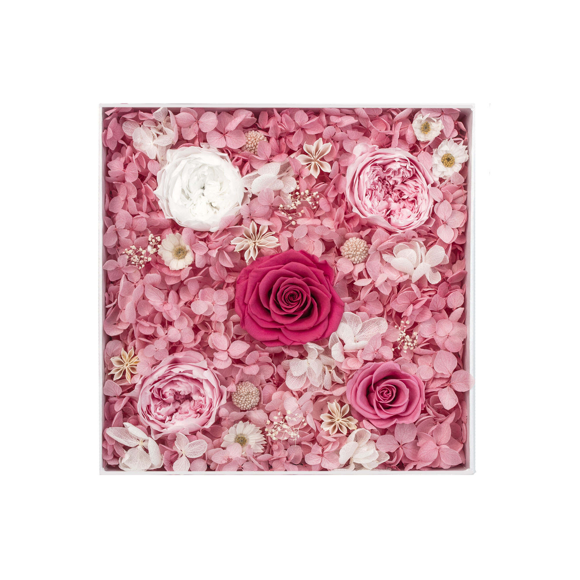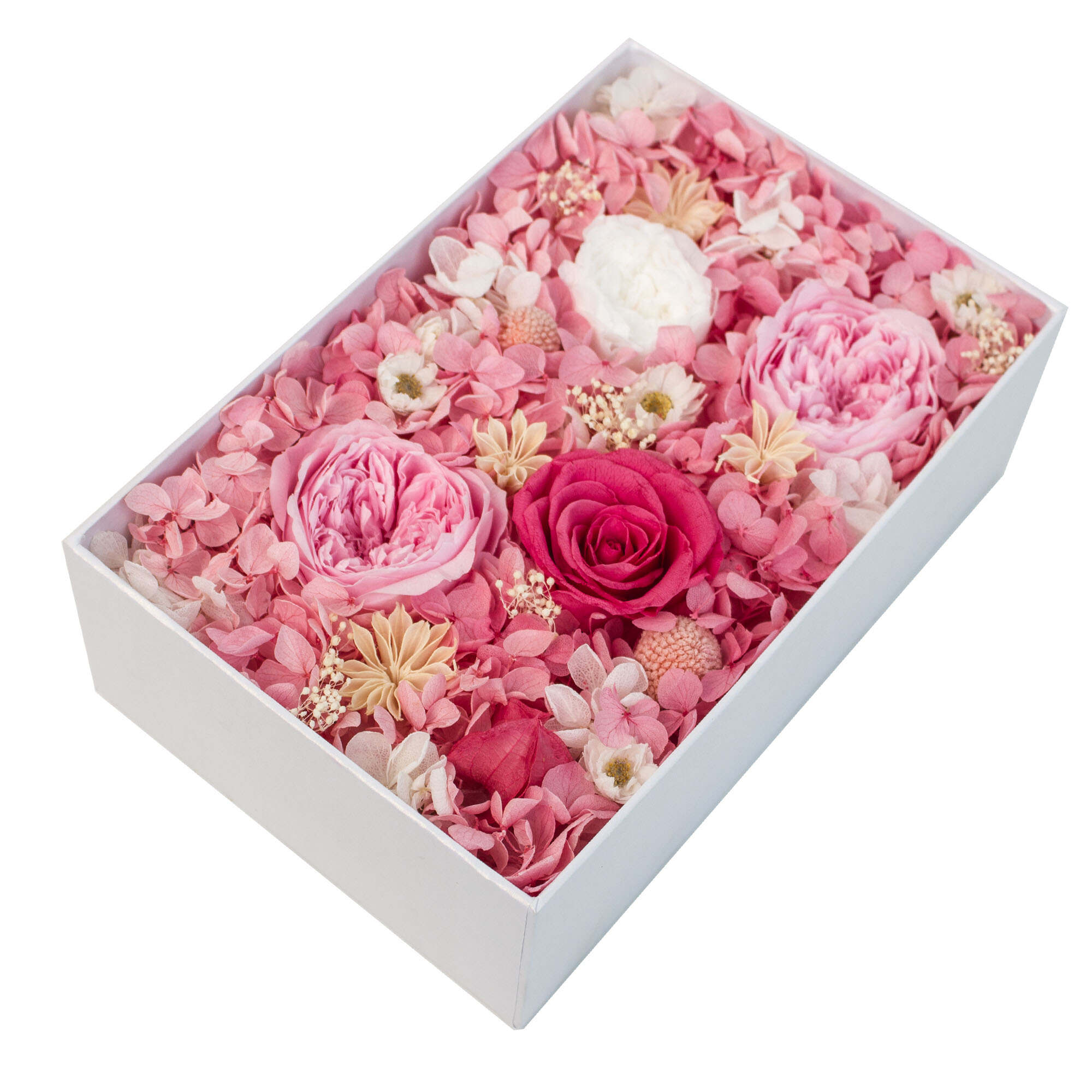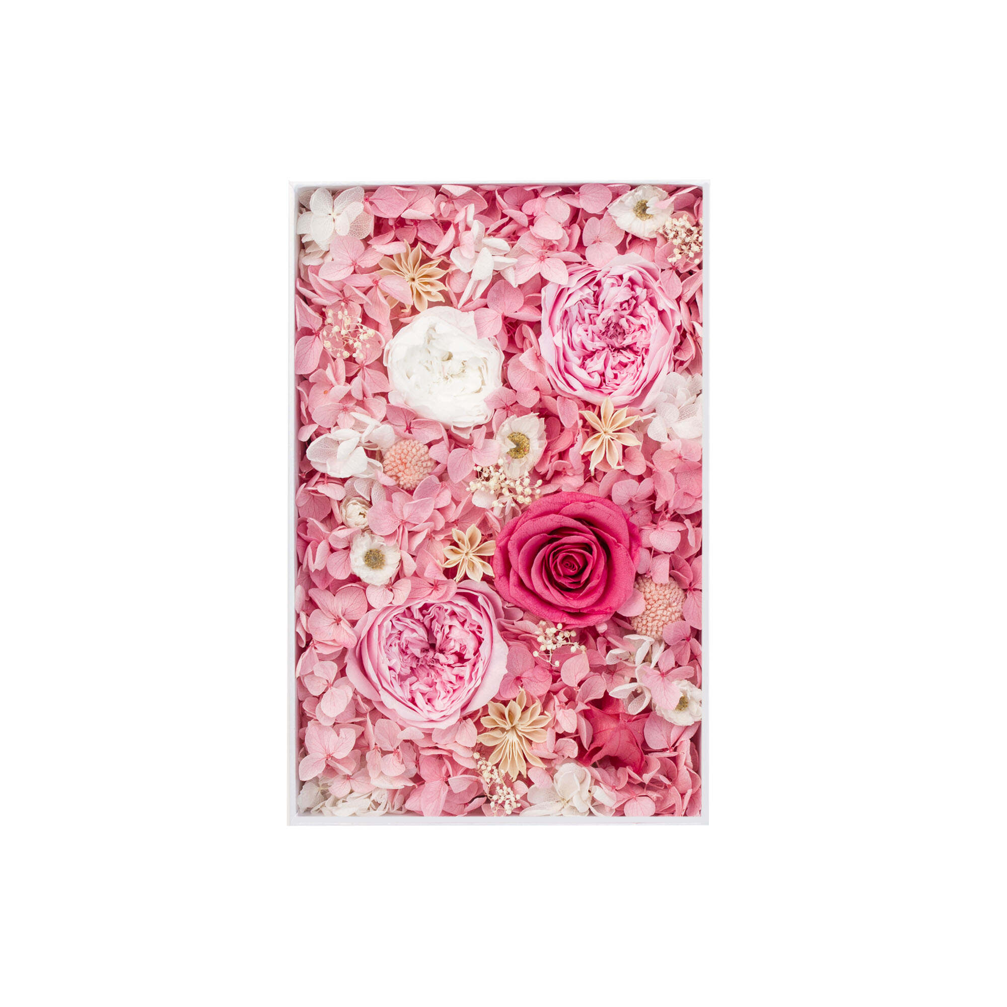 Blomsterlåda med konserveradeHortensior, Ros, Brudslöja, Risblomma, Solbollar, Tusensköna/present/hemdekoration