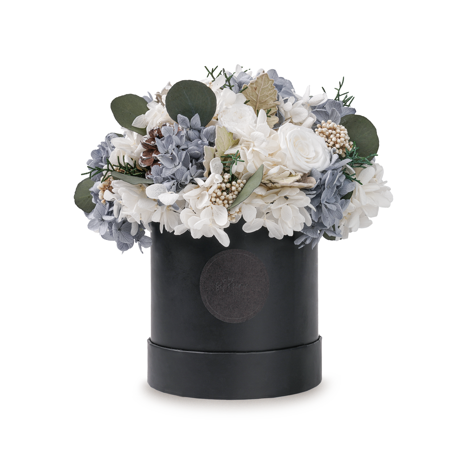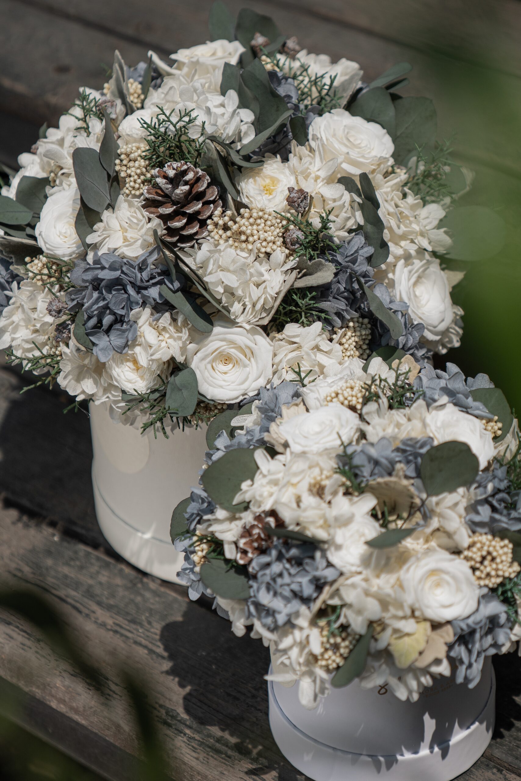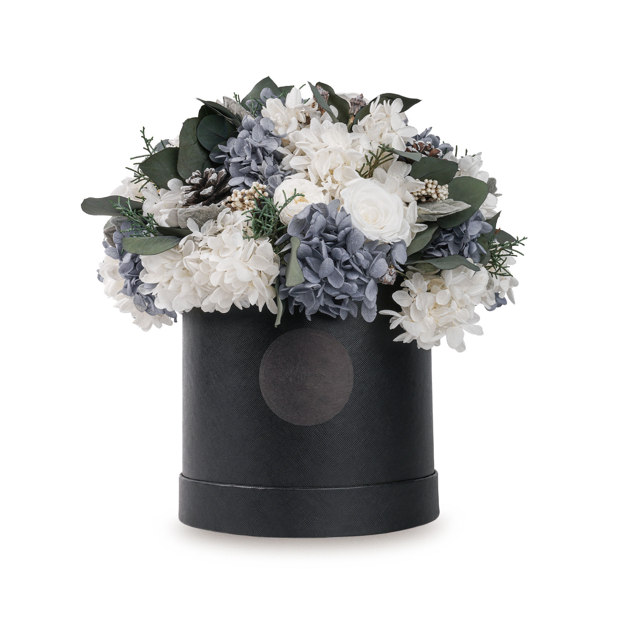 Innehåll: Hortensior, Ros, Limonium ,Eucalyptus , Risblomma ,Silver Ragwort blad och Arizona cypress