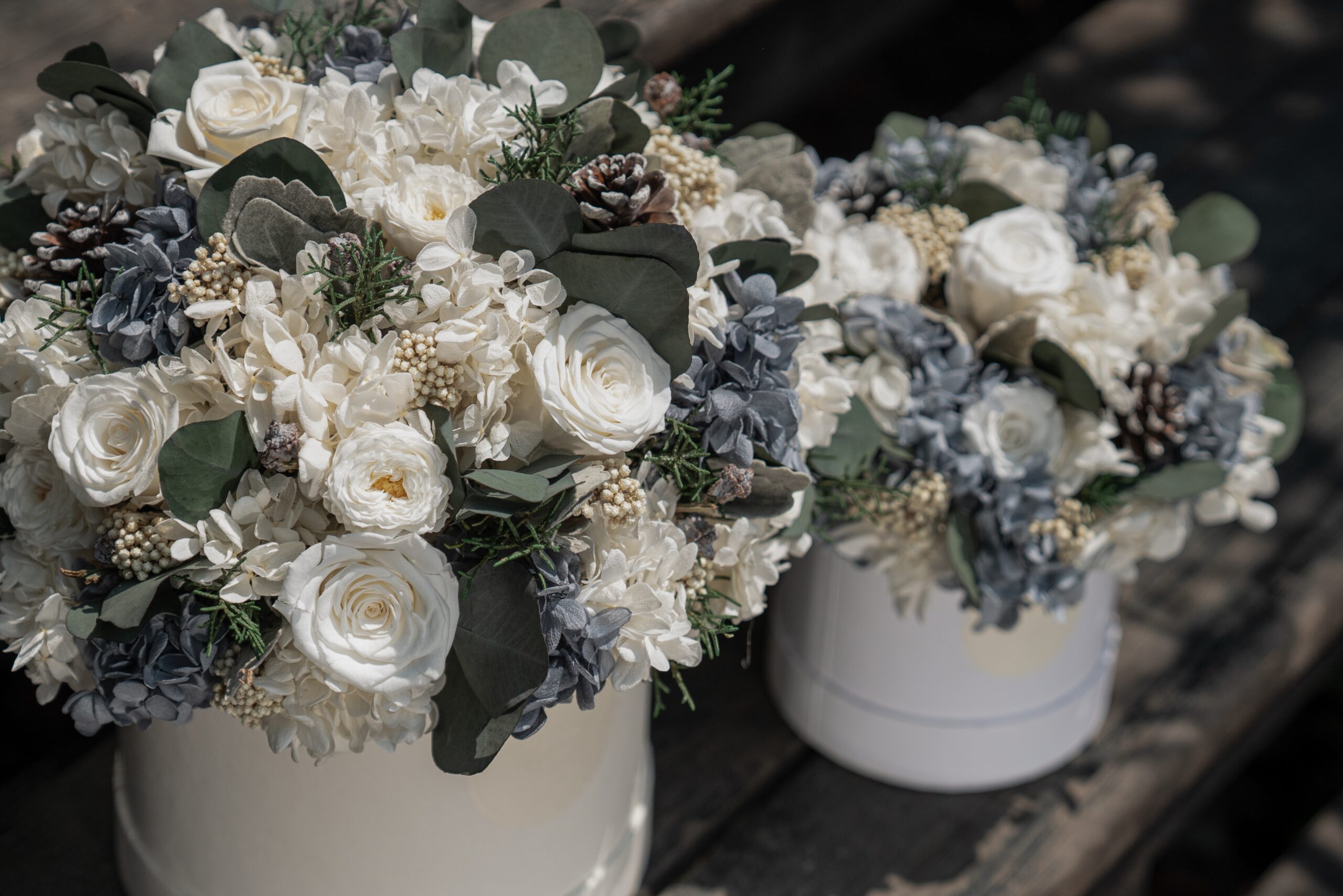Blomsterdekoration med konserverade Hortensior, Ros, Limunium, Silverek, Arizona cypress /bordsdekoration/present