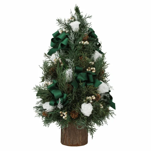 Festlig Jul – mini gran grön, är en handgjord mini-julgran med konserverad gran, vita rosor och kottar i festliga gröna färger och rosetter / dekoration / jul / present