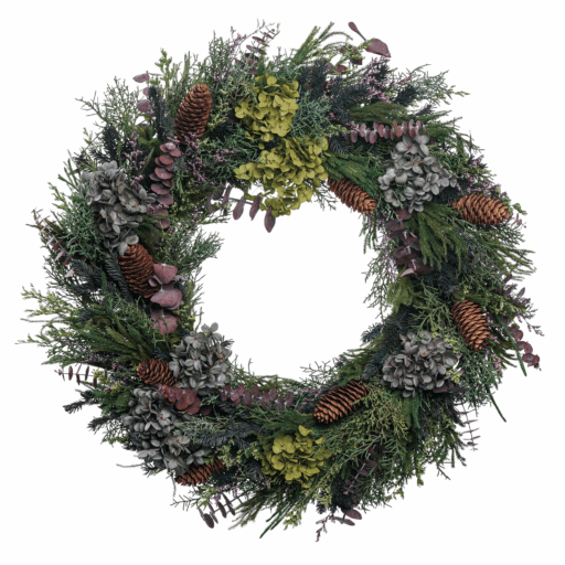 Handgjord krans av konserverade Hortensior, Eucalyptus, Limonium, Cypress, Kottar / dörrkrans / dekoration