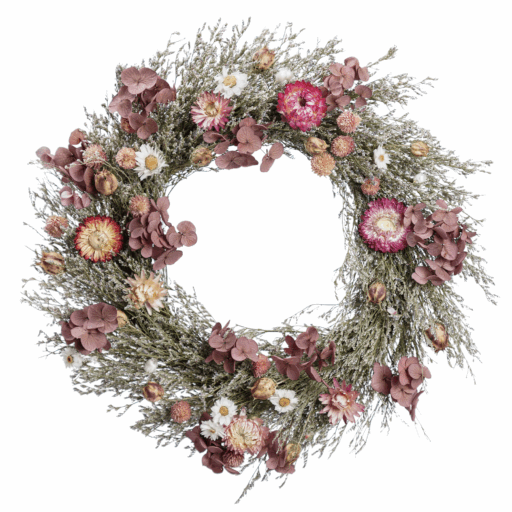 Krans med konserverade Hortensia, Limonium, Prästkrage, Halmkrysantemum / dörrkrans / dekoration