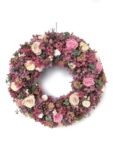 Krans med konserverade hortensior, rosor, trädgårdsrosor / lyxkrans / dekoration
