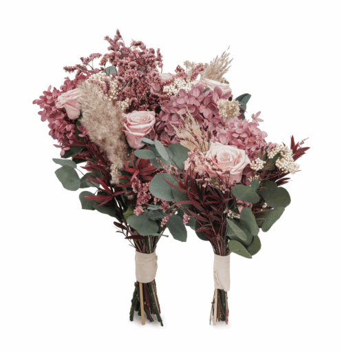 Brudbukett med konserverade Ros ,Risblomma, Eucalyptus,Syren Hortensia ,Limonium sinuatum ,pampas gräs